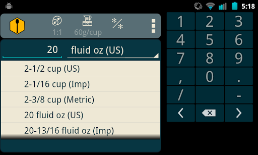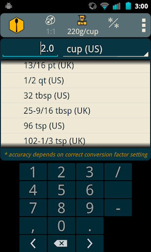* Makes the coveted "grams to cups" conversion, as well as other weight/volume conversions, based on user-selectable weight factor parameter: contains common 180 quick-searchable ingredients with factors already figured.